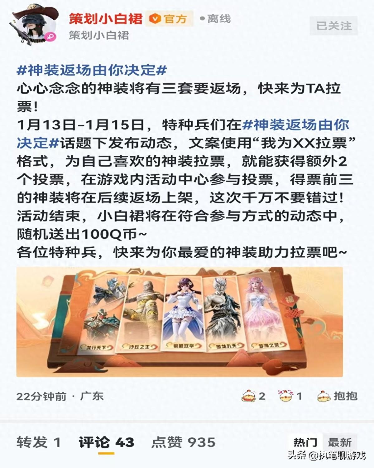 在1.13的上午10點時,光子的小白裙在和平營地裏正式官宣,並且公佈了紅裝“6選3”的票選返場相關事宜。