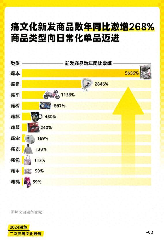 2024年,閒魚上的痛文化新發商品數同比上一年增長268%。其中,痛本的新發商品數同比增幅高達56倍、痛扇增幅高達28倍、痛車高達11倍,其他痛文化商品新發數也均呈倍數增長。