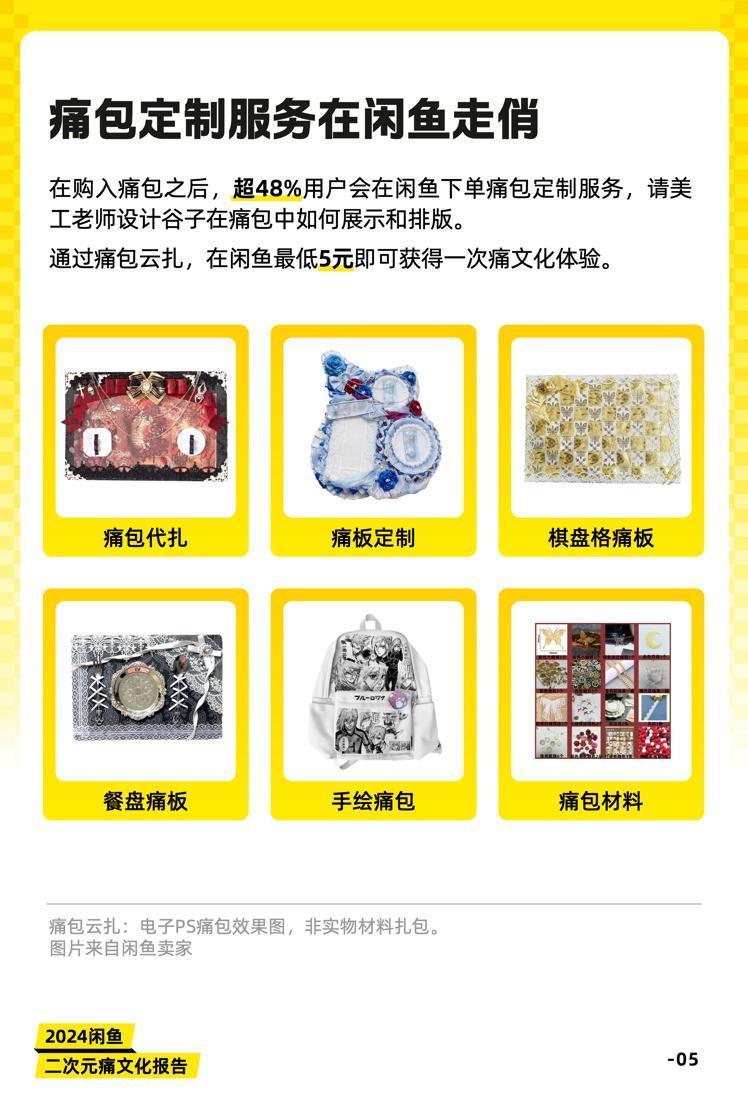 報告顯示,超48%的用戶購入痛包之後會在閒魚下單痛包定製類服務,包括痛包代扎、痛包雲扎、痛板(依據痛層大小設計,用來裝飾和陳放穀子的背板)定製等。其中,棋盤格痛板和餐盤痛板是閒魚時下最受歡迎的痛板定製類型,購置痛包穀美材料的手作圈賣家和個人玩家也不再少數。此外,美術功底要求更高的手繪也成爲越來越多人心儀的裝飾痛包方式。