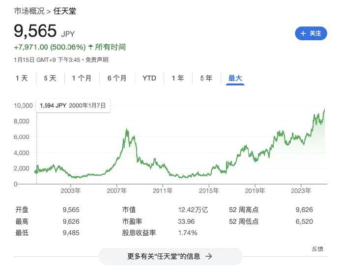 今日(1月15日)股市開盤時,任天堂株式會社股價上漲了3.2%,達到了每股9,565日元。這是自任天堂1983年上市以來的股價最高峯。
