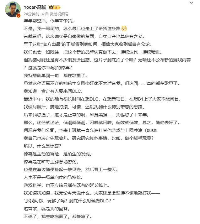 隨後,馮驥發文稱驚喜和DLC什麼時候做,都在歌裏了。似是在佐證網友們的猜想。