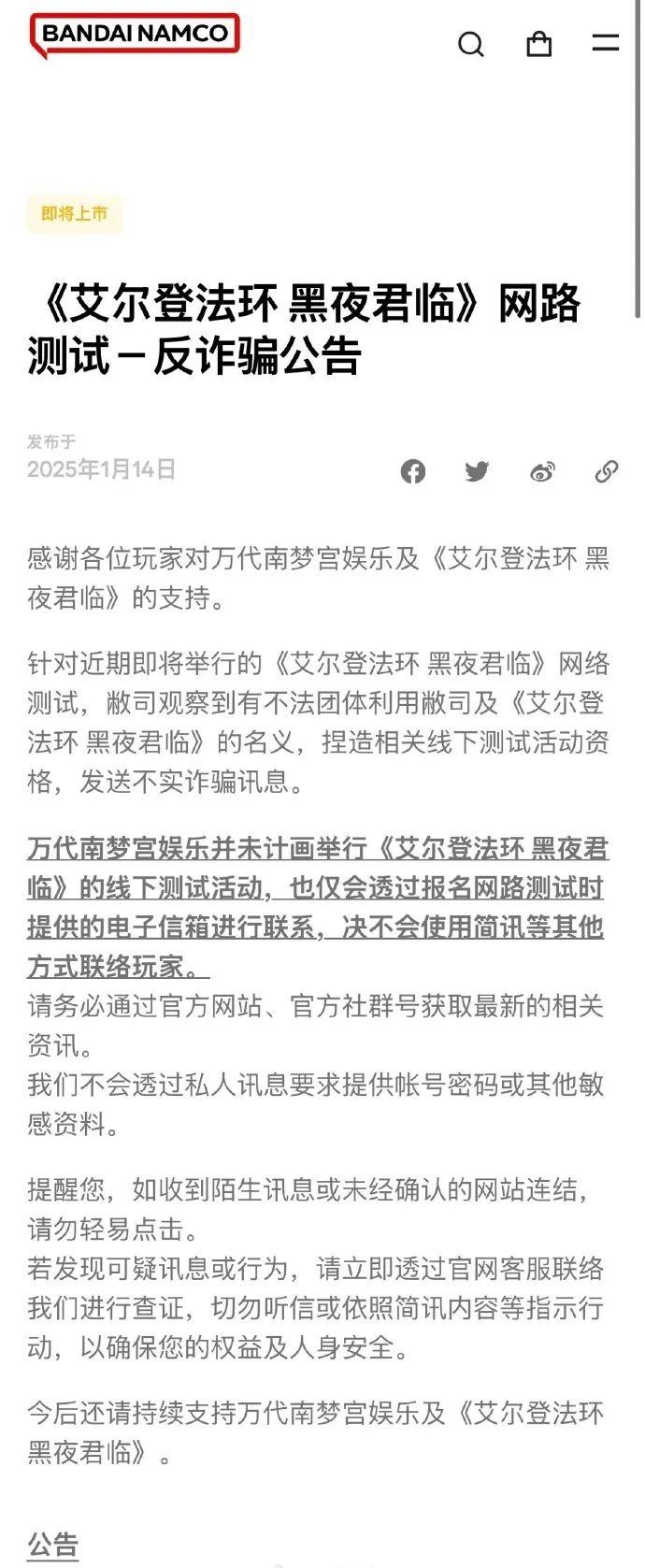 萬代官方隨即發佈聲明,稱該遊戲還沒有公開過任何線下試玩渠道,僅有官網測試報名,並且只會通過官方郵件形式與玩家聯絡。請各位玩家注意甄別,以防上當受騙。