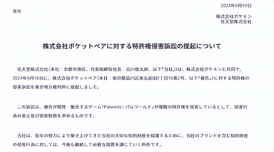 最搞的是,任天堂9月份才起訴《幻獸帕魯》侵犯專利,結果等到11月份就勝訴了。