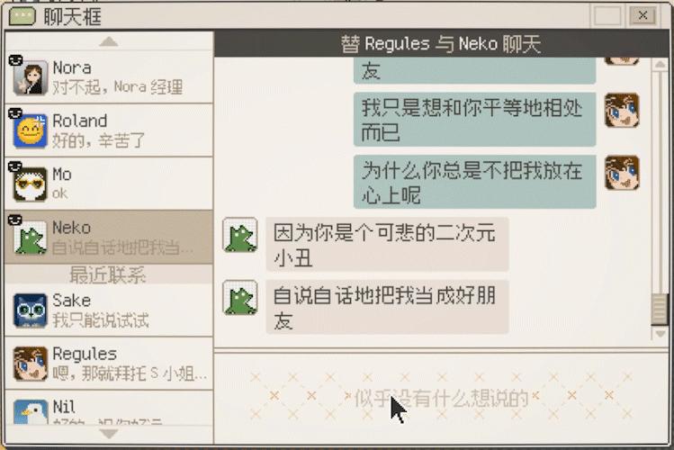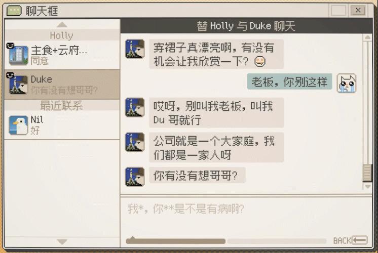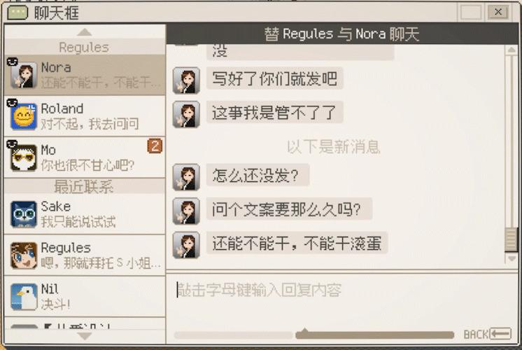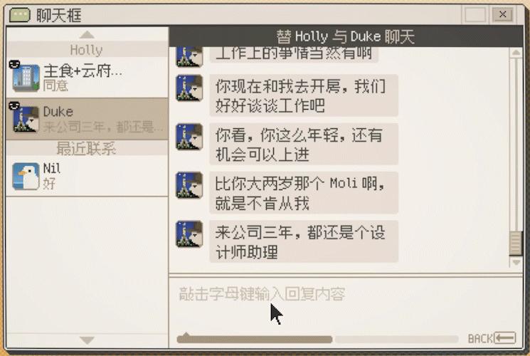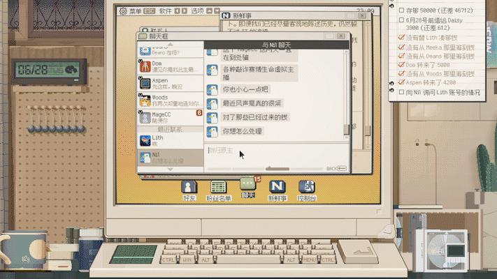 玩家每天兼職要做的,就是打開電腦,反覆查看聯繫人名單、聊天框、新鮮事。遊戲裏的鍵盤反應,和現實玩家敲鍵盤相對應,所以通過錄屏裏的鍵盤能看出來,我是亂按的。