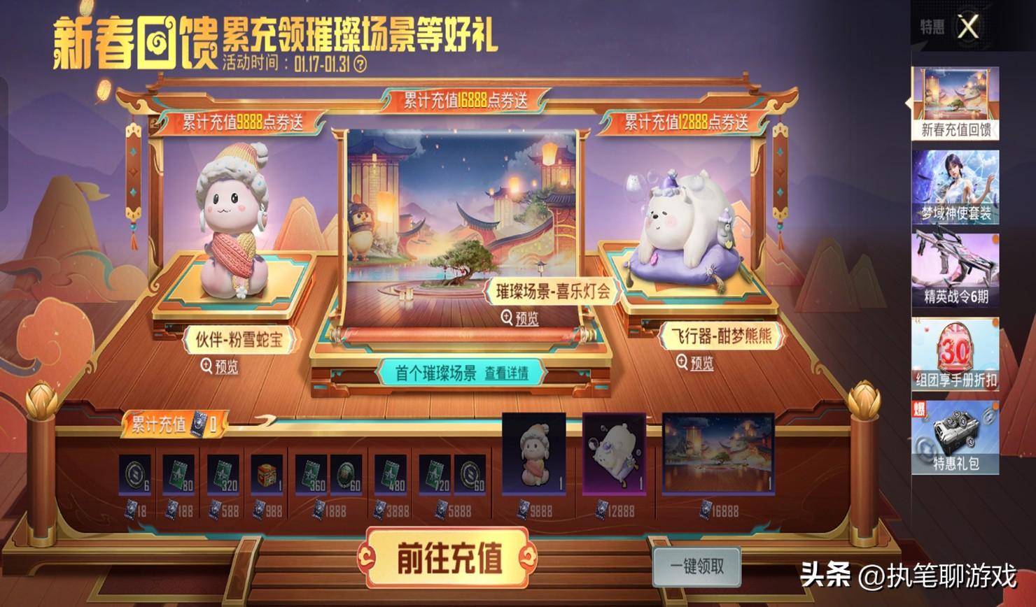 累充達到9888點券即可獲得寵物“粉雪蛇寶”,累充達到12888點券可以獲得飛行器“酣夢熊熊”,累充達到16888點券可以獲得主題場景“喜樂燈會”!