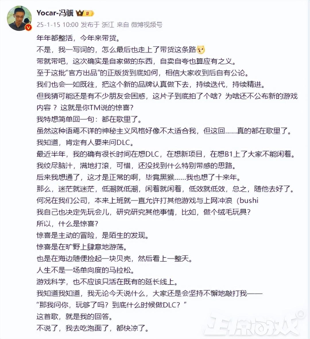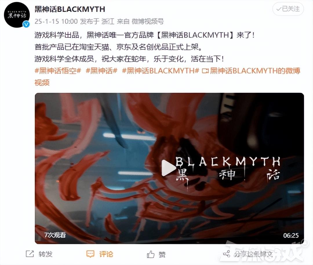隨着短片的發佈,官方還推出了 “黑神話 BLACKMYTH” 品牌的首批周邊產品,涵蓋了服裝、玩偶、包袋、配飾以及家居用品等多個領域,滿足了不同玩家的需求。這些周邊產品設計精美,價格親民,迅速吸引了大量粉絲的關注和購買,目前多款產品基本已經脫銷。同時主創馮驥表示DLC的信息全在視頻的歌裏。