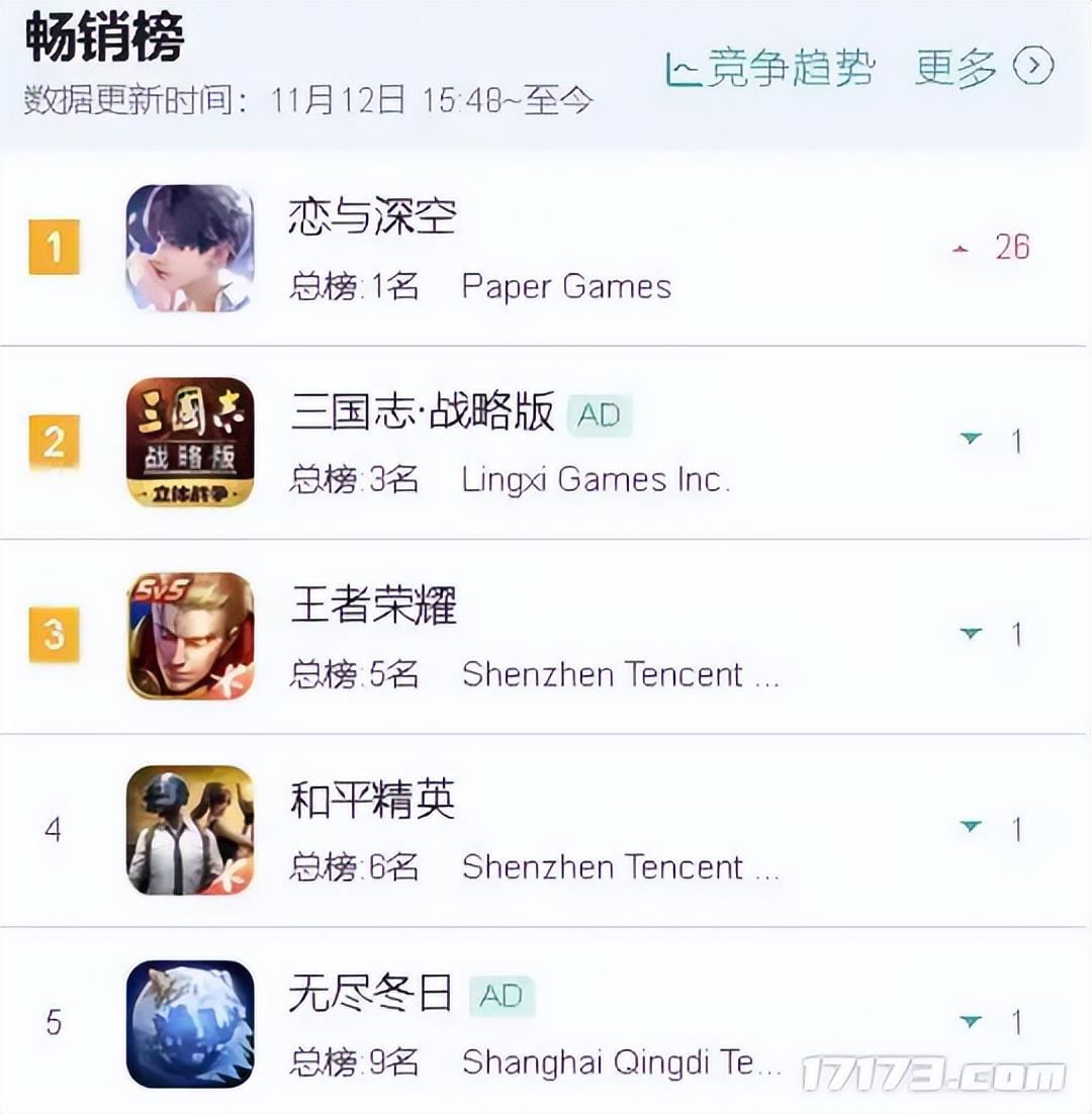 除了在海外走紅外,《戀與深空》在國內的表現也相當彪悍,四次超越《王者榮耀》和抖音,衝上ios暢銷榜總榜第一,僅iOS端流水就超13.07億元,國內總收入預估超40億元。