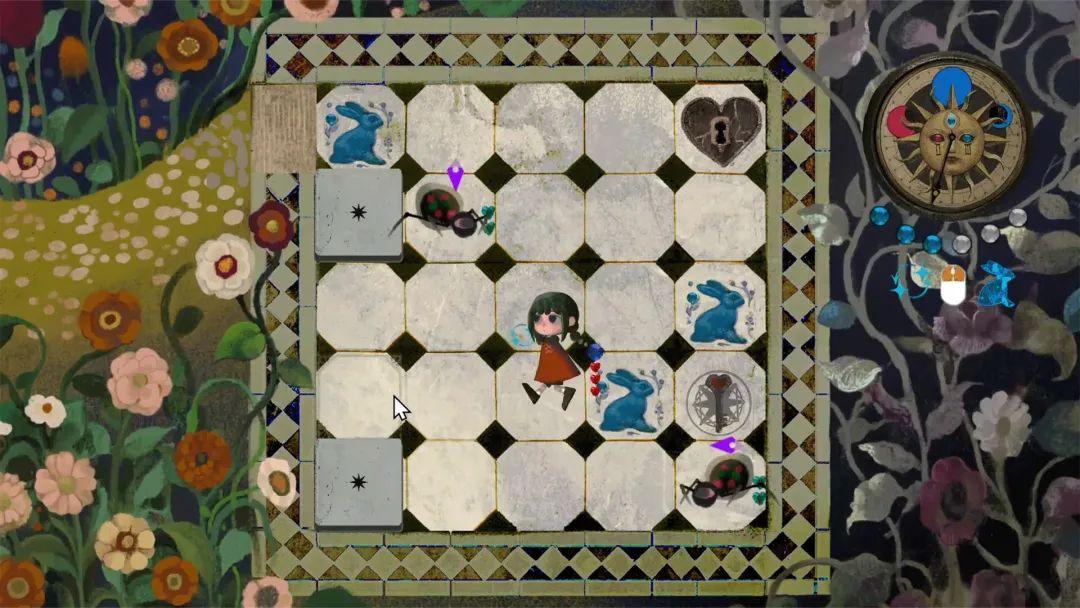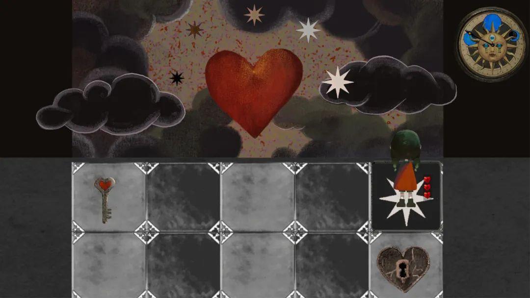 或許是【上鎖的棋盤空間】,觸目所及是棋盤與封鎖的心門。玩家可以在由多個正方形格子組成的不規則棋盤上移動,每一關都需要以不同的方式取得鑰匙、解鎖、過關。