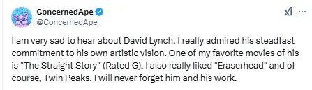 《星露穀物語》製作人特此發表推文悼念:“聽到大衛·林奇的死訊,我感到非常難過。我非常欽佩他對自己藝術夢想的堅定。我永遠不會忘記他和他的作品。”