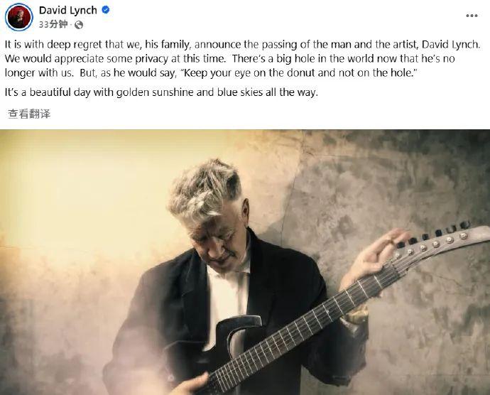 他的家人在林奇的社交媒體宣佈了這一消息,並寫道:“他不在了,世界留下一個洞,但就像他生前所說,‘把目光放在甜甜圈上而不是那個洞上……’今日天氣晴好,陽光明媚,藍天清澈。”