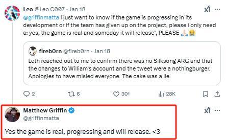 對此,《空洞騎士:絲之歌》市場營銷負責人「Matthew Griffin」在推特上回復玩家,表示《絲之歌》是真實存在的,遊戲正處於開發中且將會發布。