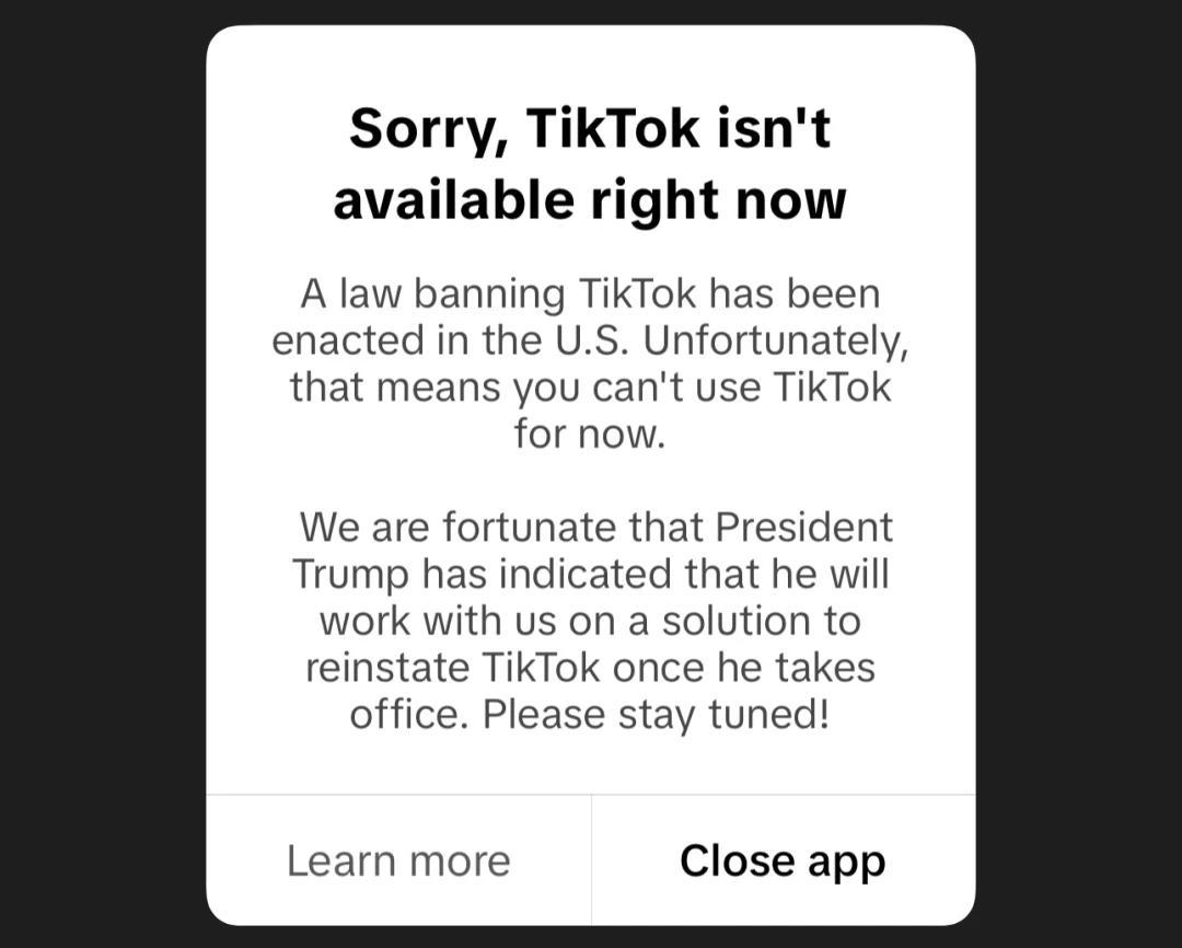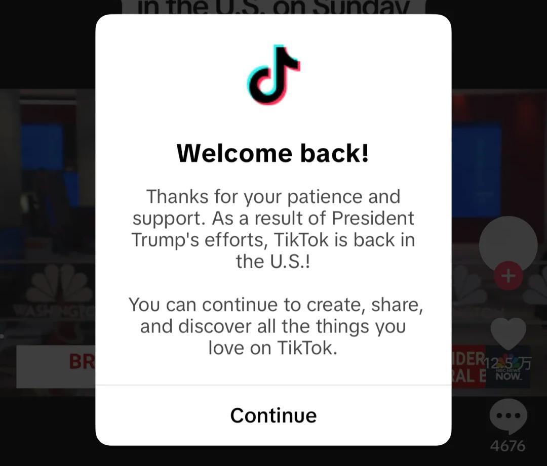 並且,TikTok對美國用戶發佈了最新通知:美國已頒佈禁止TikTok的法律,這意味着您暫時無法使用TikTok。