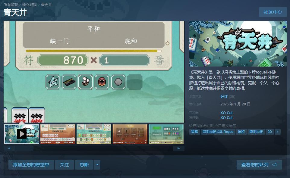 今天推薦一款以麻將爲主題的卡牌roguelike遊戲,《青天井》。你也可以稱它爲小丑牌麻將版。