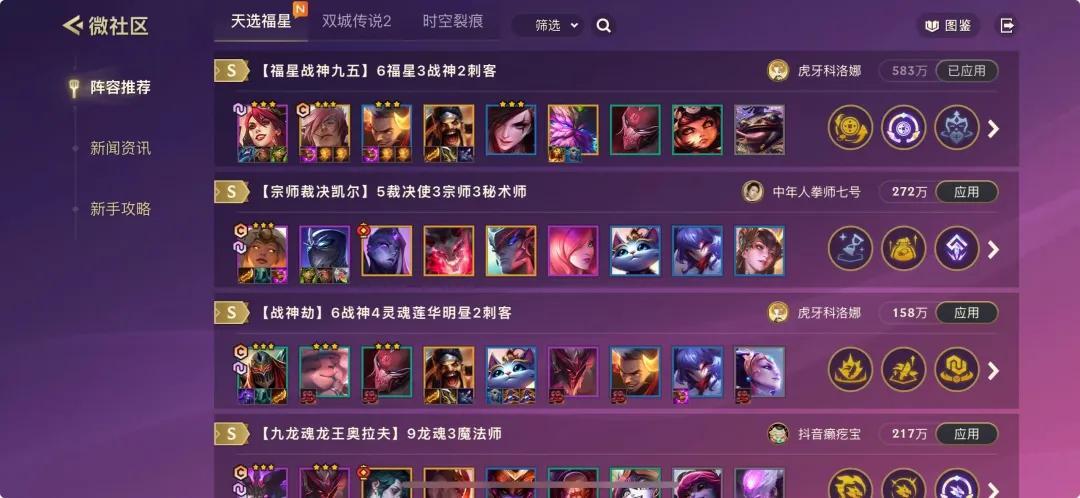 在降低玩家上手門檻方面,《金剷剷之戰》也做了不少舉措,例如在遊戲內,他們會根據不同玩家需求進行個性化陣容推薦,兼顧不同玩家的學習成長需求。還有陣容碼一鍵導入功能,方便玩家早期「抄作業」。在社區中,利用直播平臺、短視頻、公衆號提供豐富的攻略、教學、直播內容,來幫助用戶瞭解遊戲技巧。