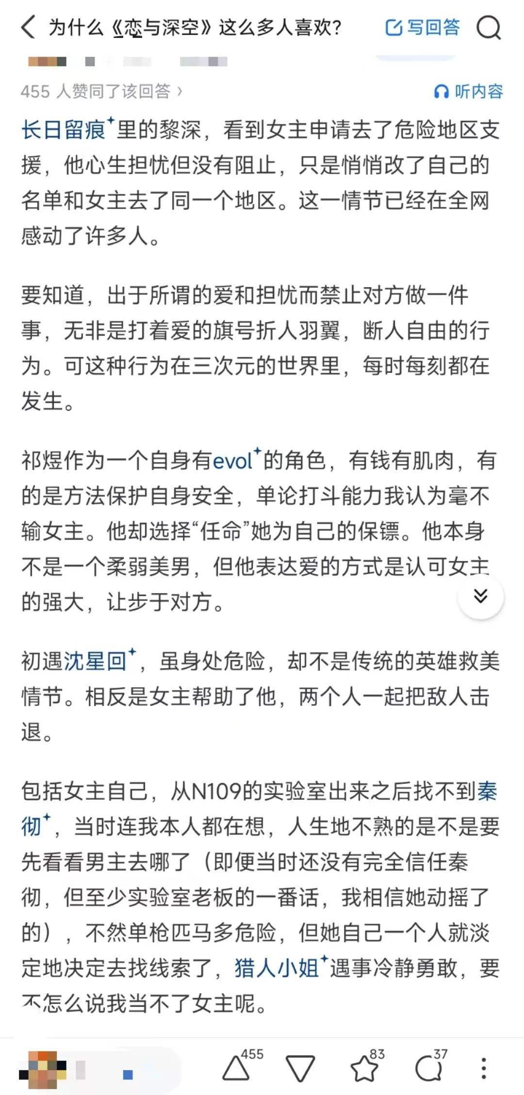 它也讓很多人重新認識了女性的情緒訴求,看到了之前被忽視的一面。有關注女性向的業內朋友告訴我,乙遊終究拼的是團隊如何挖掘女性的真實需求,而《戀與深空》或許印證了,女性玩家需要的並不只是如夢如幻、轟轟烈烈的戀愛故事。如真實男友般的陪伴,以及希望和伴侶成爲雙強搭子,而非總是被保護的一方……這些都是真實的情緒訴求,只是先前沒被注意到罷了。
