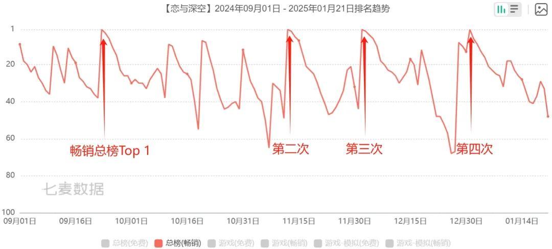 這事放以前,任誰看都要驚掉下巴:乙遊能這麼風光?但如今,眼看《戀與深空》4次登頂iOS暢銷總榜(不是遊戲榜,是總榜),我竟覺得習慣了。一次兩次登頂,我們可以說是意外之喜;但連續三次四次……這大概不是偶然,而是《戀與深空》的常態水平。