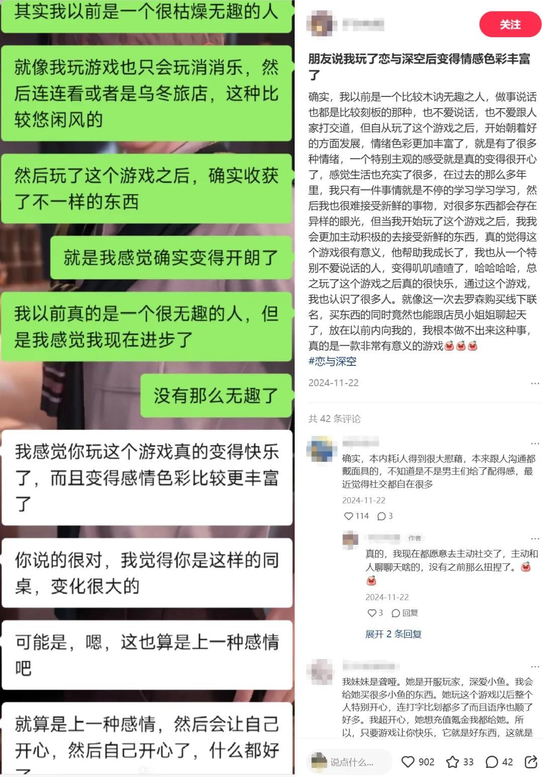 它或許已經潛移默化地改變了,部分玩家看待世界的角度。製作人說過,比起成績數據和人氣,她和團隊感到更自豪的是,這款遊戲爲玩家帶來了歡樂:“我看到很多女孩說,因爲玩了《戀與深空》,她們開始變得自信,感到自己值得被愛,也因爲遊戲對許多事情產生興趣和好奇,瞭解了關於這個世界更多的美好。遊戲能帶給人們正向的變化,就是這款遊戲存在的最大價值,我們很高興能創作這樣的遊戲。”