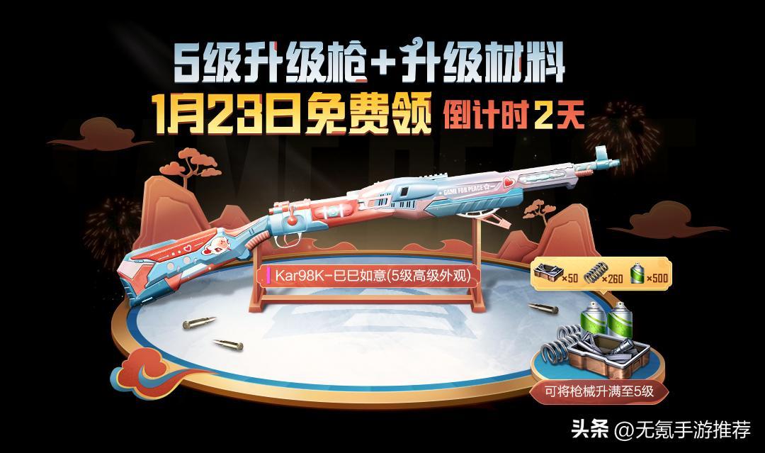 1月23日登錄的特種兵,可直接領取“Kar98K-巳巳如意(1級)”槍。別看它現在只有1級,領取後便可解鎖階段2的相關任務,通過完成任務獲得的積分即可自由兌換Kar98K的專屬升級材料。