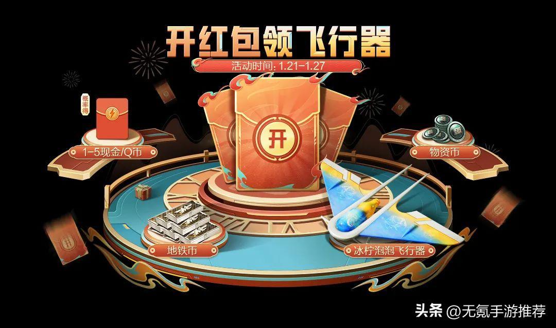 1月21日-27日,特種兵們通過每日登錄、每日首次共享以及TA人的共享獲得福卡,集齊五種不同福卡合成紅包,就有機會獲得現金/Q幣獎勵,而當開啓紅包次數達到8次後,將獲得和平精英有史以來首款免費飛行器——“飛行器-冰檸泡泡”!