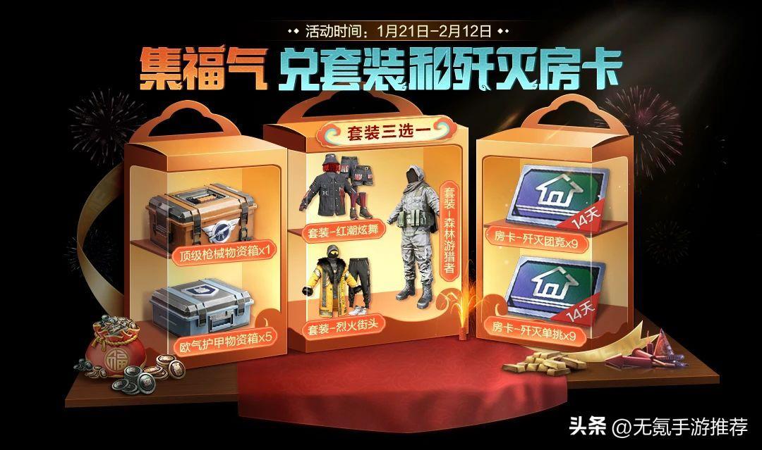 地鐵逃生模式的福利同樣滿滿:1月21日-2月12日期間,特種兵邀請好友上線可集福氣值,消耗福氣值,不僅能在“紅潮炫舞”、“森林遊獵者”、“烈火街頭”三款酷炫套裝中任選其一,還可換取殲滅4V4房卡、殲滅1V1房卡、頂級槍械物資箱,歐氣護甲物資箱,物資幣、服飾幣、福利碎片等豪華物資。