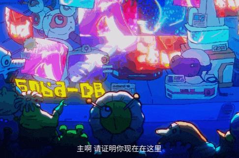 “主啊,請在歌曲結束時救救我”,以及後面唱詩班一樣的人聲吟誦“我的父親,我的宇宙”,這些直白略帶諂媚的歌詞,恰巧對應着動畫裏外星人如同參觀馬戲團的觀衆一樣圍坐在屏幕前的橋段,早已麻木的寵物人類也一齊觀看着節目。