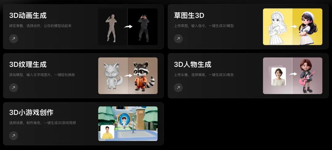 它還有更多有趣或實用的功能。在混元3D AI創作引擎上,我們除了能生成和編輯模型,以及剛纔提到的單獨使用紋理模型功能外,還能用草圖生成3D、頭像照片轉3D人物、製作一些簡單的3D人物動畫,甚至直接創作3D小遊戲等。