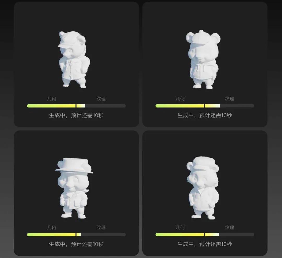 從體驗來看,用戶只需要輸入中/英文提示詞,提供對模型主題的描述、特徵、風格等Prompt,就能快速同時生成4個3D模型,葡萄君自己實際體驗的感受是,如果僅對模型做最基礎的要求,那麼基本上只要30秒左右,4個模型就能全部生成。