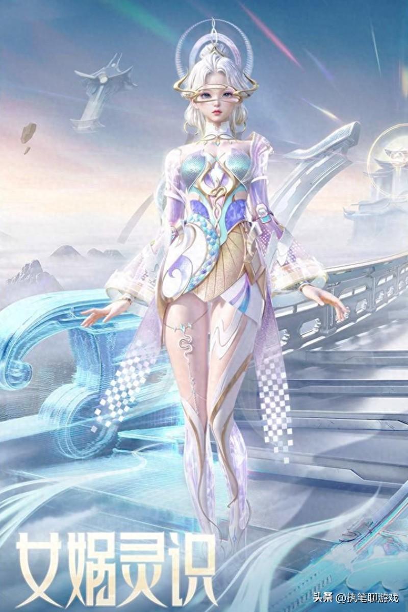 首先我們來說“女媧靈識”,七彩上衣光彩奪目,腰間還有蛇鱗圖案,亮點是手部環繞着的“特效小人”,賦予穿戴者如創世神明的神聖感。天哥覺得頭頂的“光環”挺有趣,這樣的設計也算是爲女角色量身打造了。