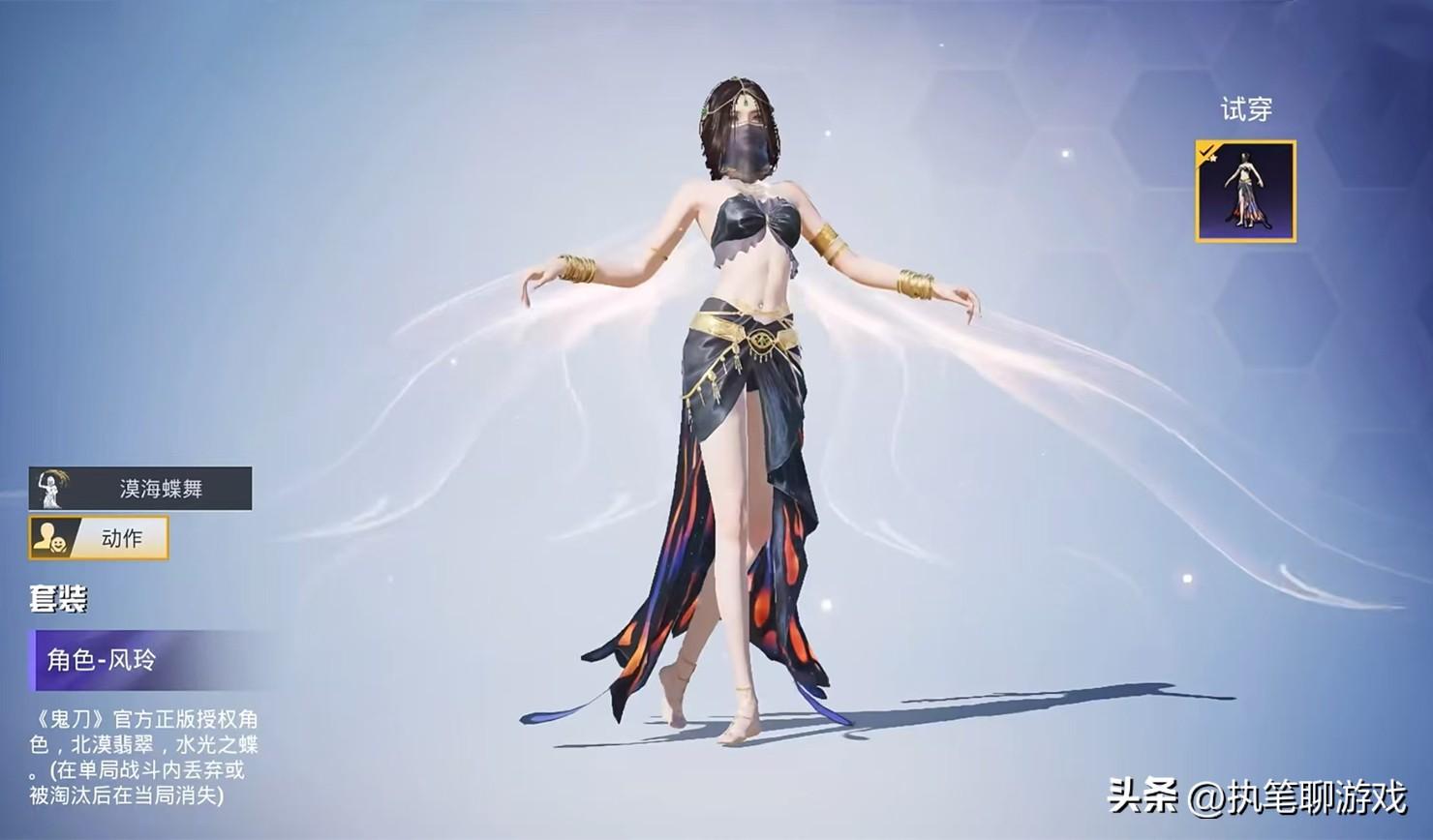 接下來出場的同樣是角色“風鈴”,看到第一眼就有種意外驚豔的感覺,輕薄的面紗掩飾不住的異域風情,曼妙舞姿更顯妖嬈,兩片式的裙身設計形如蝶翼,起舞猶如蝴蝶振翅,可以說是相當夢幻的視覺感受了。