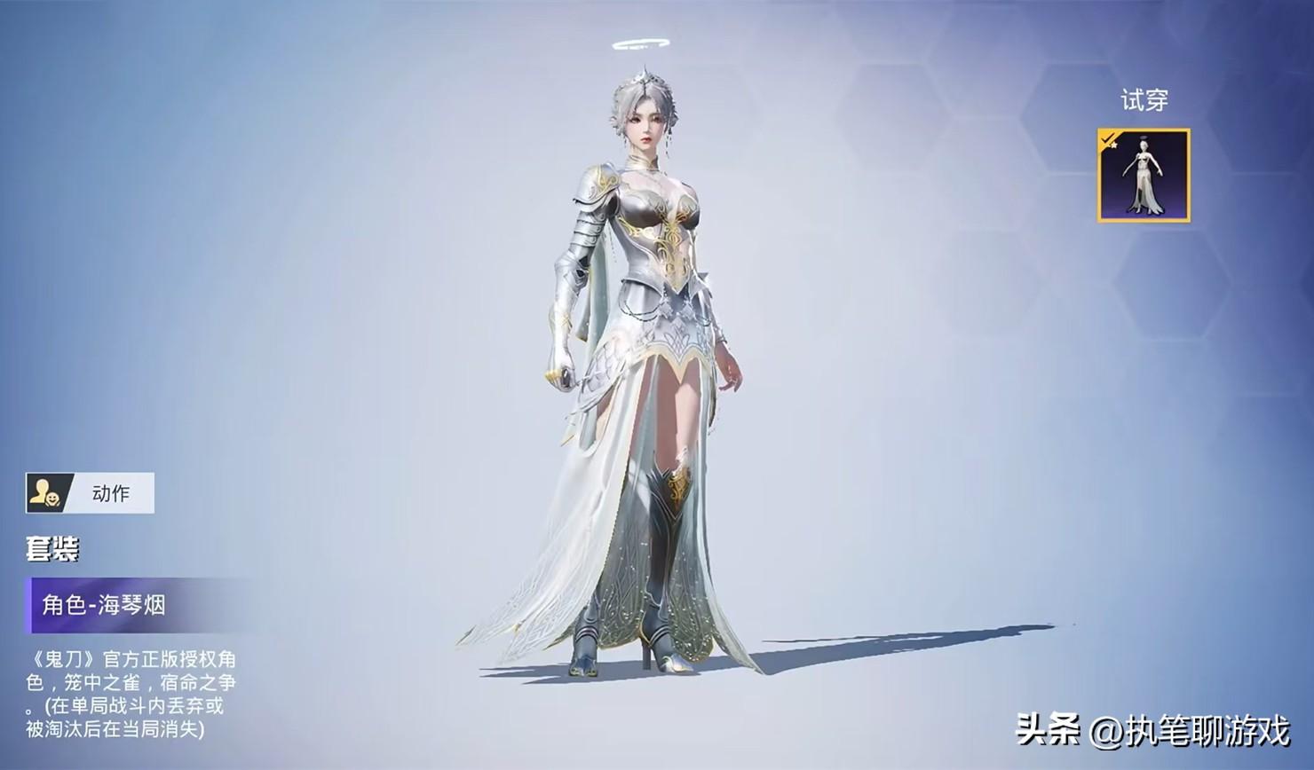 然後是第3個角色“海琴煙”,這個角色的設計同樣頗有創意,銀色的臂鎧貼合手臂,而另一隻手臂則是珠寶裝飾,再加上清冷高雅的銀色頭環、白色披肩長巾,行動之間還會隨風舞動,可以說是貴氣十足了。