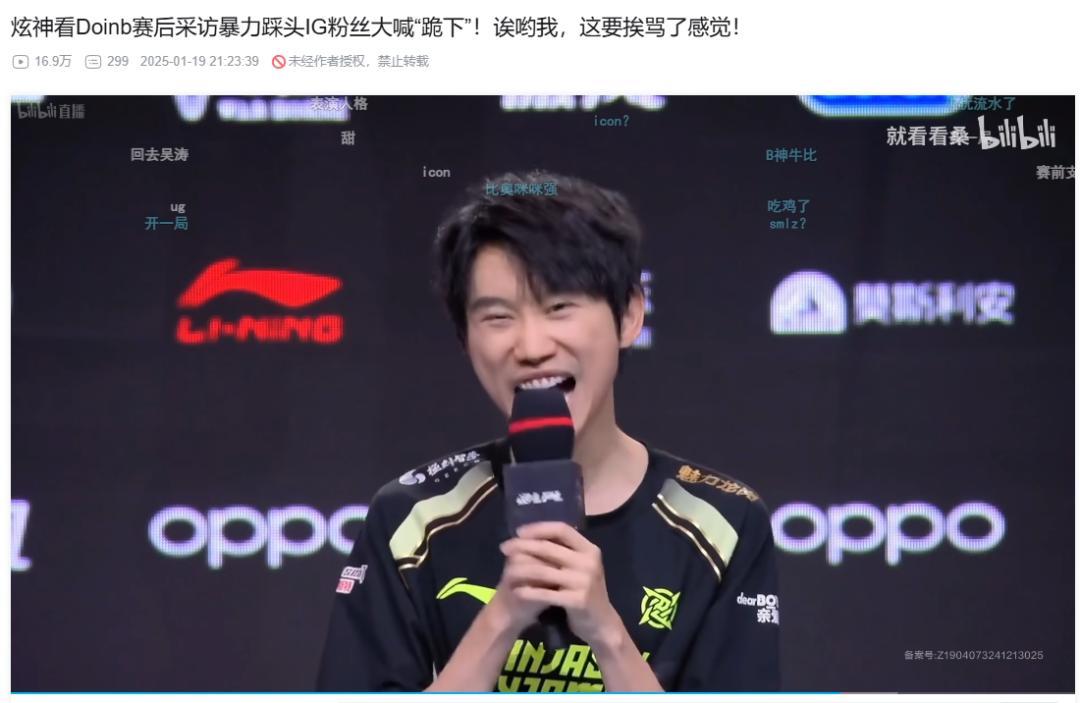 事情發生在,NIP方Doinb的賽後採訪,在5分鐘的問答最後,Doinb被問及“想對一路以來支持你的粉絲說什麼”。這是個很公式的問題,最平常的應對方式就是表達下感謝,但Doinb顯得有些激動,他提到賽前的支持率是97%比3%,要感謝那3%願意支持NIP的粉絲。