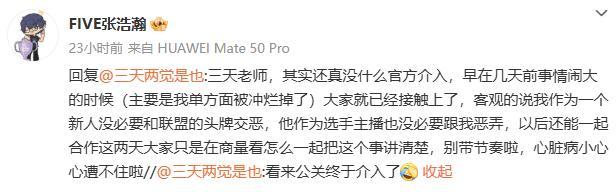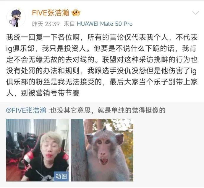 iG投資人張浩瀚(電競圈老人了,之前在暴雪、星際圈較知名)繼續發微博回擊,表示Doinb的行爲傷害了iG俱樂部的粉絲,自己無法接受。