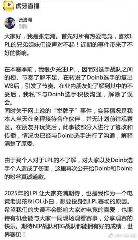 有趣的是,張浩瀚特地提到“沒有官方介入”,還去Doinb直播間刷了價值不菲的禮物,Doinb也是一口一個“張哥”,氣氛其樂融融。但LOL經紀人涵藝卻稱,兩人的道歉不情不願,暗示聯盟官方在背後施壓,但沒有罰款。