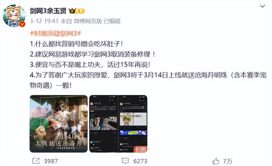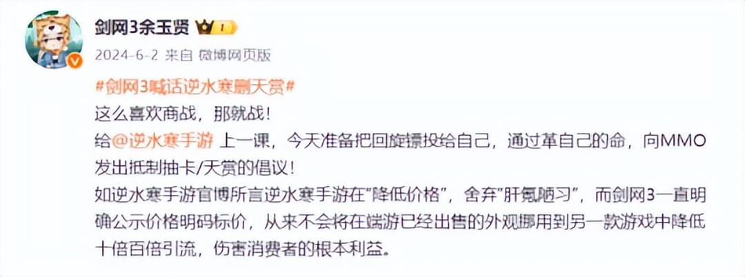 面對別人的跳臉,《劍網3》製作人餘玉賢的回應也是十分強硬,反手就一個靈魂拷問:“活過15年再說”。