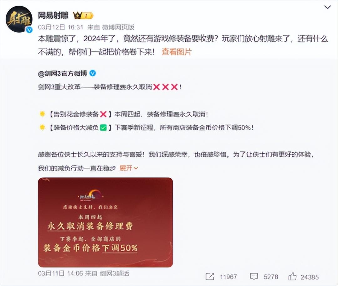 事情起因是《劍網3》宣佈取消修理費用,並下調商店裝備金幣的價格,惹來了隔壁喫瓜羣衆《射鵰》的關注。《射鵰》當即一個閃現跳臉,表示這都2024了,居然還有遊戲修裝備要錢,覺得十分不可思議。