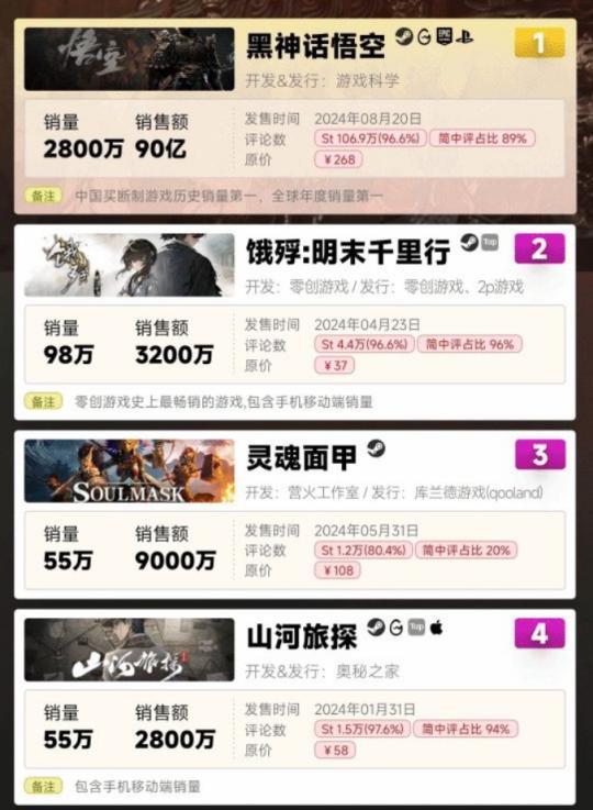 根據2024年國遊銷量榜顯示,截止於2024年底《黑神話:悟空》全球銷量已超2800萬,銷售額破90億,給國產單機市場注入一根強心劑。