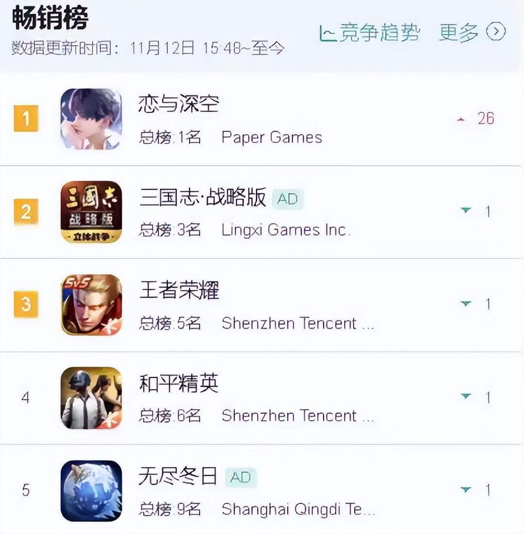 除了在海外走紅外,《戀與深空》在國內的表現也相當彪悍,四次超越《王者榮耀》和抖音,衝上ios暢銷榜總榜第一,僅iOS端流水就超13.07億元,國內總收入預估超40億元。