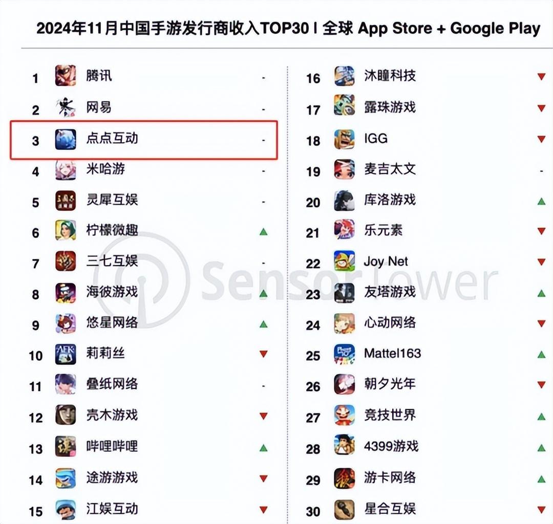 則是點點互動旗下《無盡冬日》成了2024年的最大贏家,僅憑一個《無盡冬日》就賺了超100億人民幣(約14.3億美元),成功超越米哈遊位居中國手遊發行商全球收入榜單Top3,僅次於騰訊網易兩家。