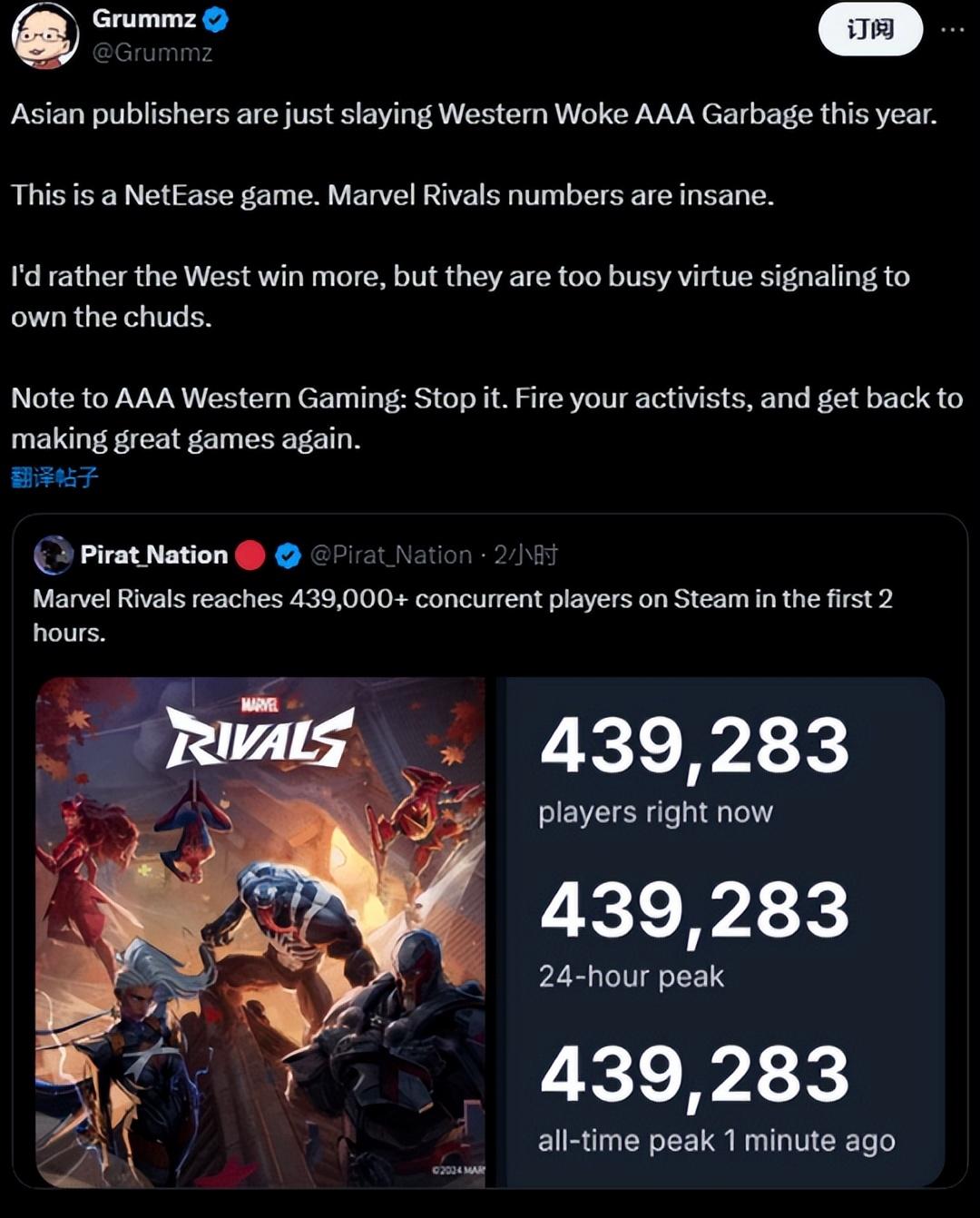 與之相對的是,網易在2024年末上線主打帥哥美女大屁股的《漫威爭鋒》就在海外賣得很火,僅用了4個小時便成功登頂Steam暢銷榜,開服不到兩週全球註冊玩家超過2000萬,一天就40萬玩家同時在線,並且在第一賽季上線後突破到60萬+同時在線。
