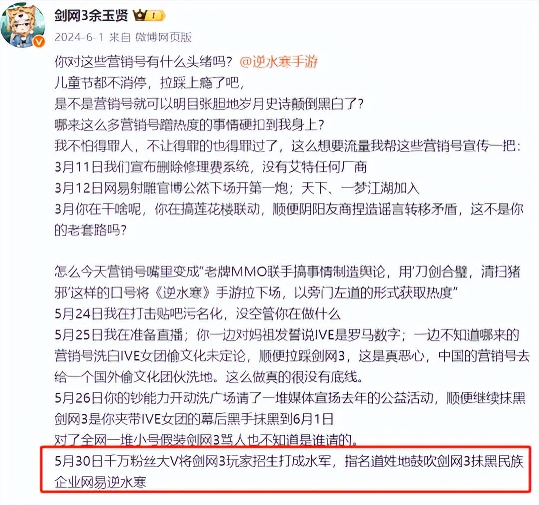 順帶一提,在6月份的時候,《劍網3》還撕了《逆水寒》一波,稱他們僱傭水軍抹黑《劍網3》以旁門左道的形式獲取熱度。