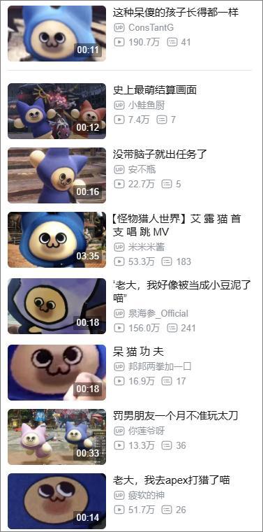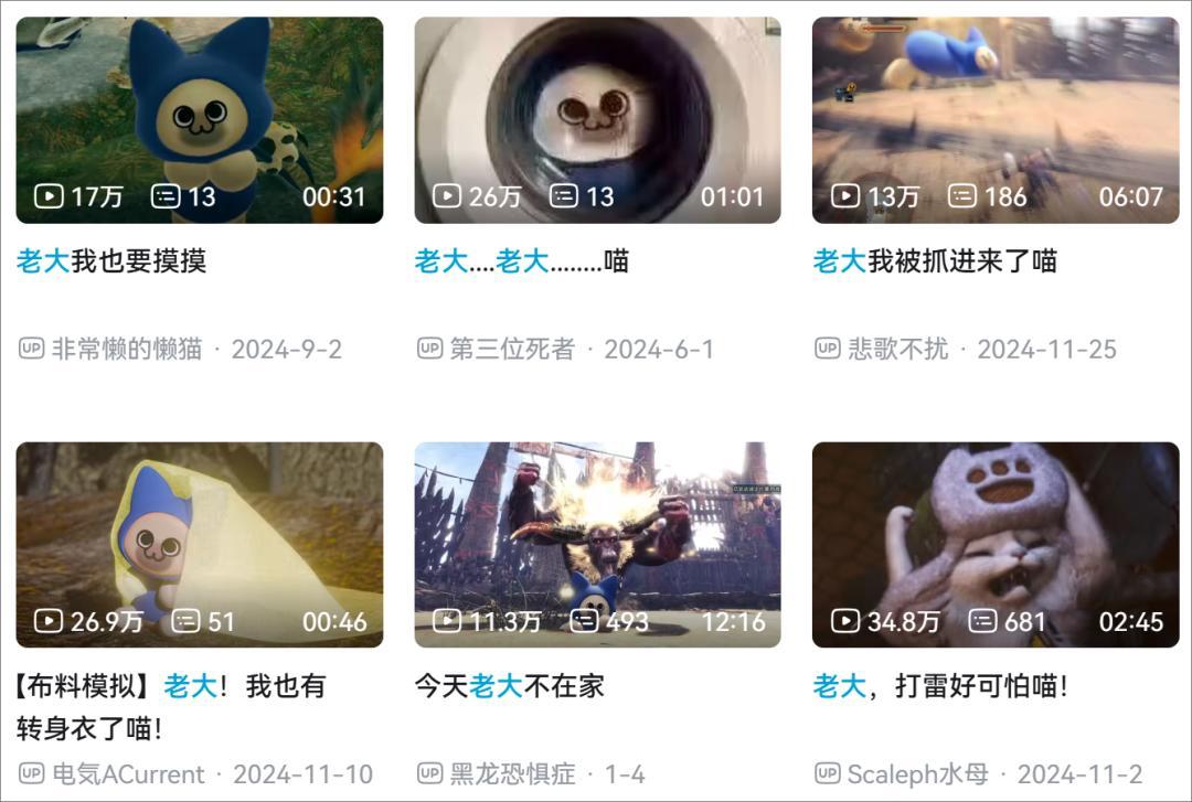 在B站搜索欄,甚至不用打出“呆貓”這個暱稱,只是把它對獵人的稱呼“老大”打進搜索框,眼神清澈的呆貓就會堆滿整個頁面。