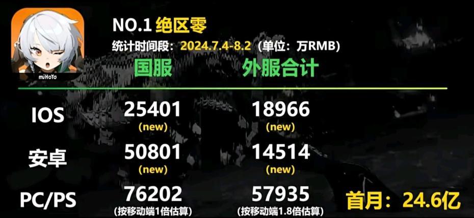 《絕區零》上線三天海外市場的雙端預估收入超6000萬元,首個自然月內斬獲了全球全平臺22-25億的流水,7月成爲全球收入增長最高的手遊。