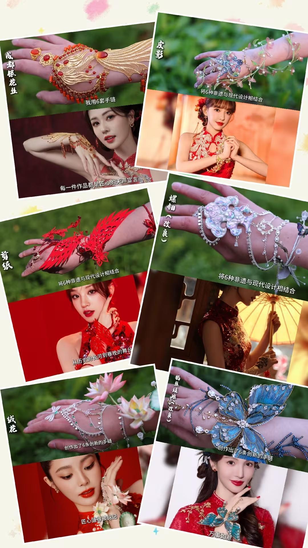這次隨《春意紅包》登臺的6款手鍊都是她設計的,裏面融合了不少巧思,用到了成都銀花絲、螺鈿、皮影、剪紙、絨花、掐絲琺琅等傳統工藝。