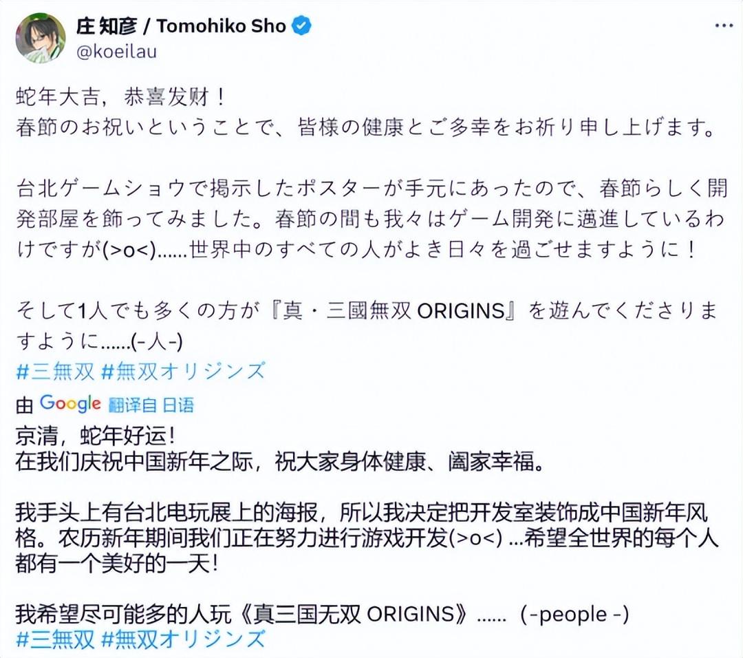 當然,購買《真三國無雙:起源》的,除了日本本土玩家外,最多的還是國服玩家,所以製作人莊知彥趕在大年初一,特意用中文“蛇年大吉,恭喜發財!”向中國玩家拜年,發佈新年祝福。