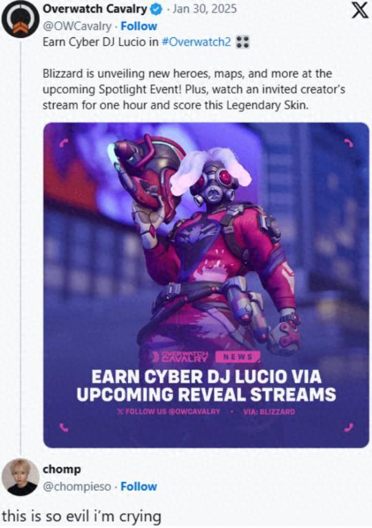 但出人意料的是,在皮膚上架幾小時後,暴雪就宣稱該皮膚參與了2月12日舉行的直播掉寶活動,玩家只需觀看一小時的合作伙伴直播有機會獲得,這令所有購買了皮膚的玩家都感到了“背刺”。