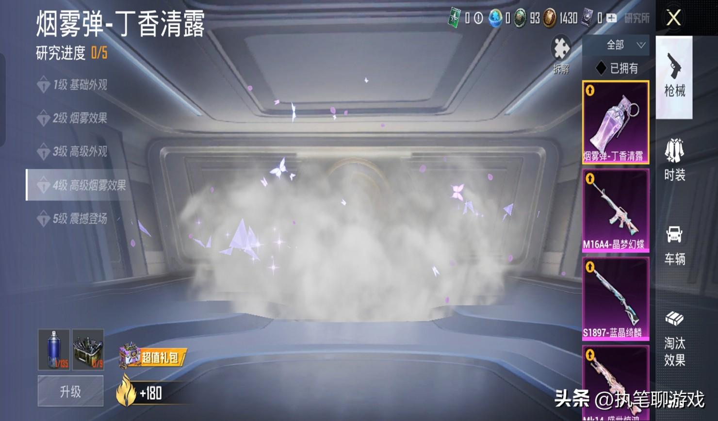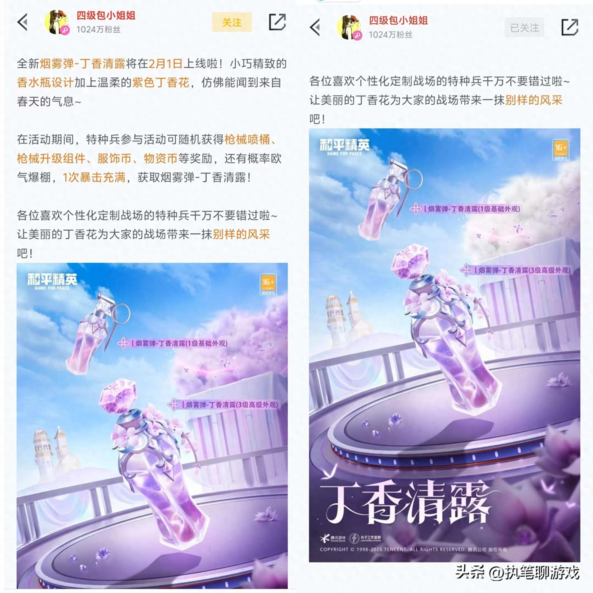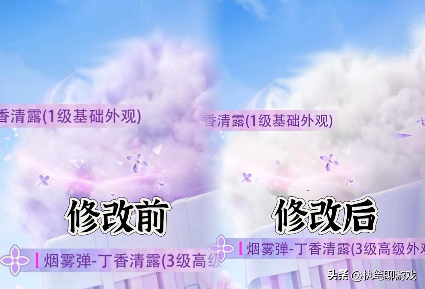 以此次的5級煙霧彈丁香清露爲例,當初光子在和平營地公佈的“第一版”裏可以清晰看到:煙霧是紫色;然而隨後很快就被光子悄悄改特效,在如今的“第二版”中,煙霧已經變成了白色。