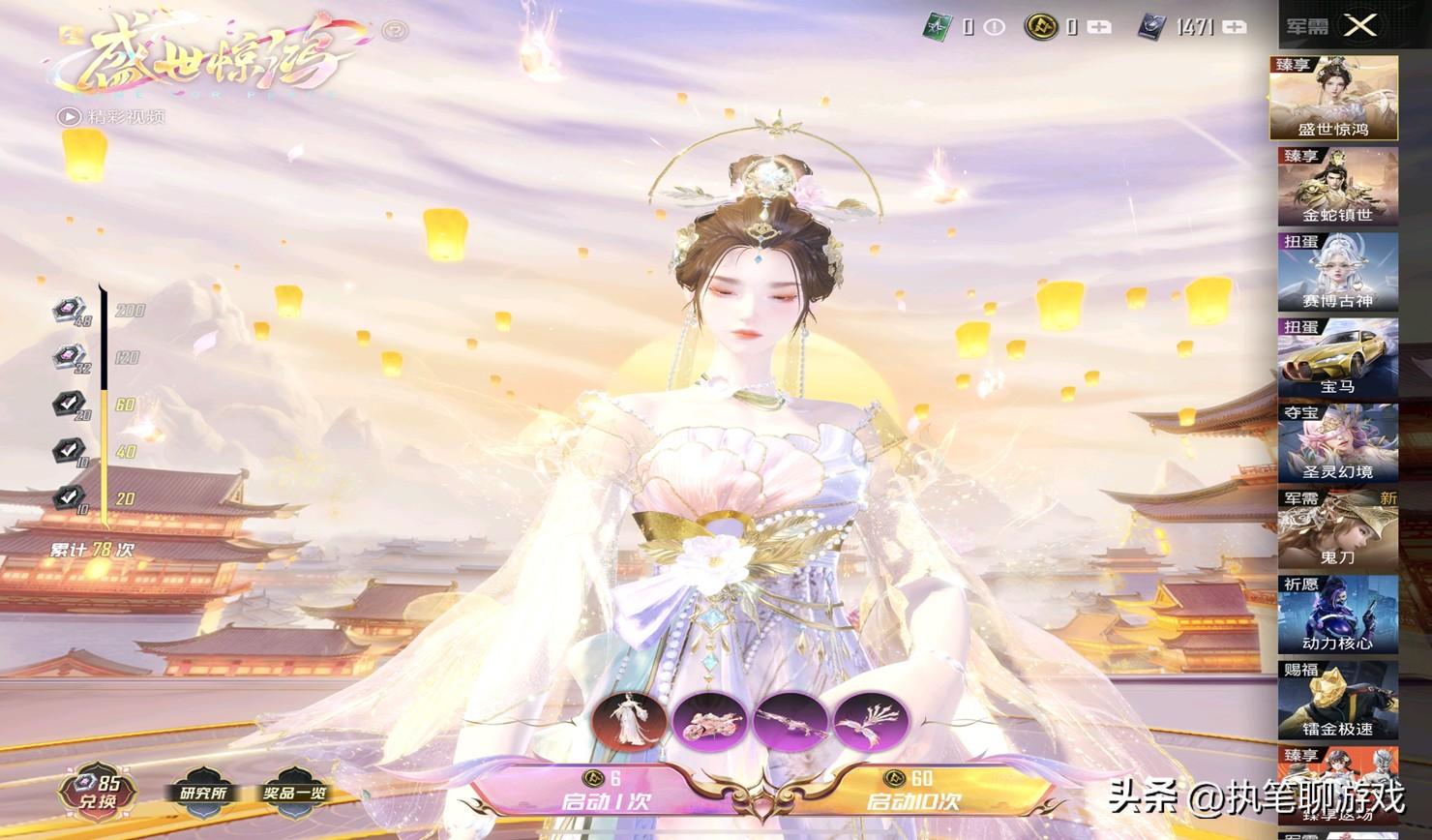 然後我們再來說盛世驚鴻,抽獎次數只是略微多那麼一點,達到了78次,但最後的結局可以看到:可以變身爲火鳳凰的飛行器已經拿下(請注意,飛行器來自碎片兌換),其他皮膚還有頭盔、揹包等。