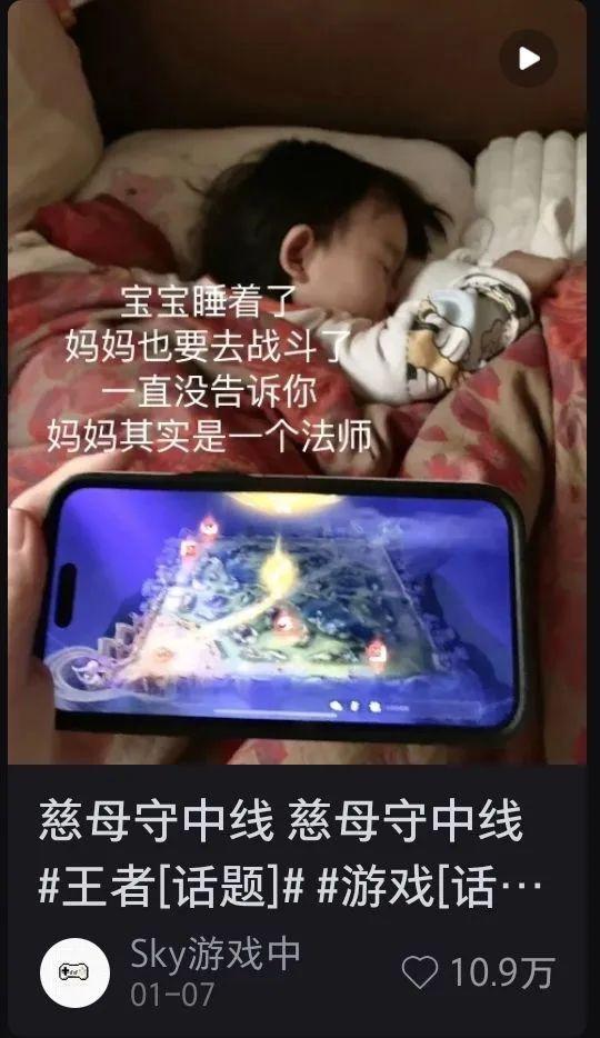 在小紅書上,有個點贊超過10萬的帖子讓我印象深刻,標題是“慈母守中線”。內容只有一張圖,就是在熟睡的孩子邊上玩王者——這裏的“守中線”指的是在王者裏打中路——一位普通的母親,在哄完孩子的短暫閒暇,掏出手機打開王者休閒一下。這就是她的解放時刻。