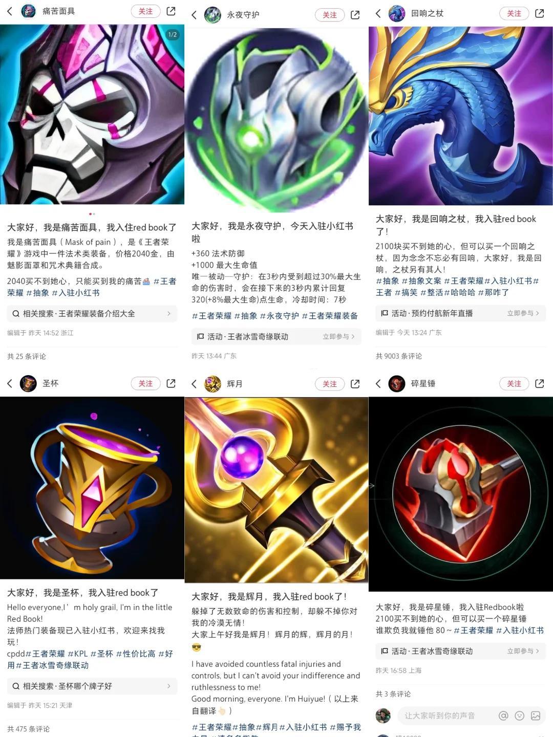 比如,這幾天在小紅書上,出現了大量以《王者榮耀》的道具、裝備擬人口吻發出的祝福貼,乍一看還以爲是遊戲成精了。