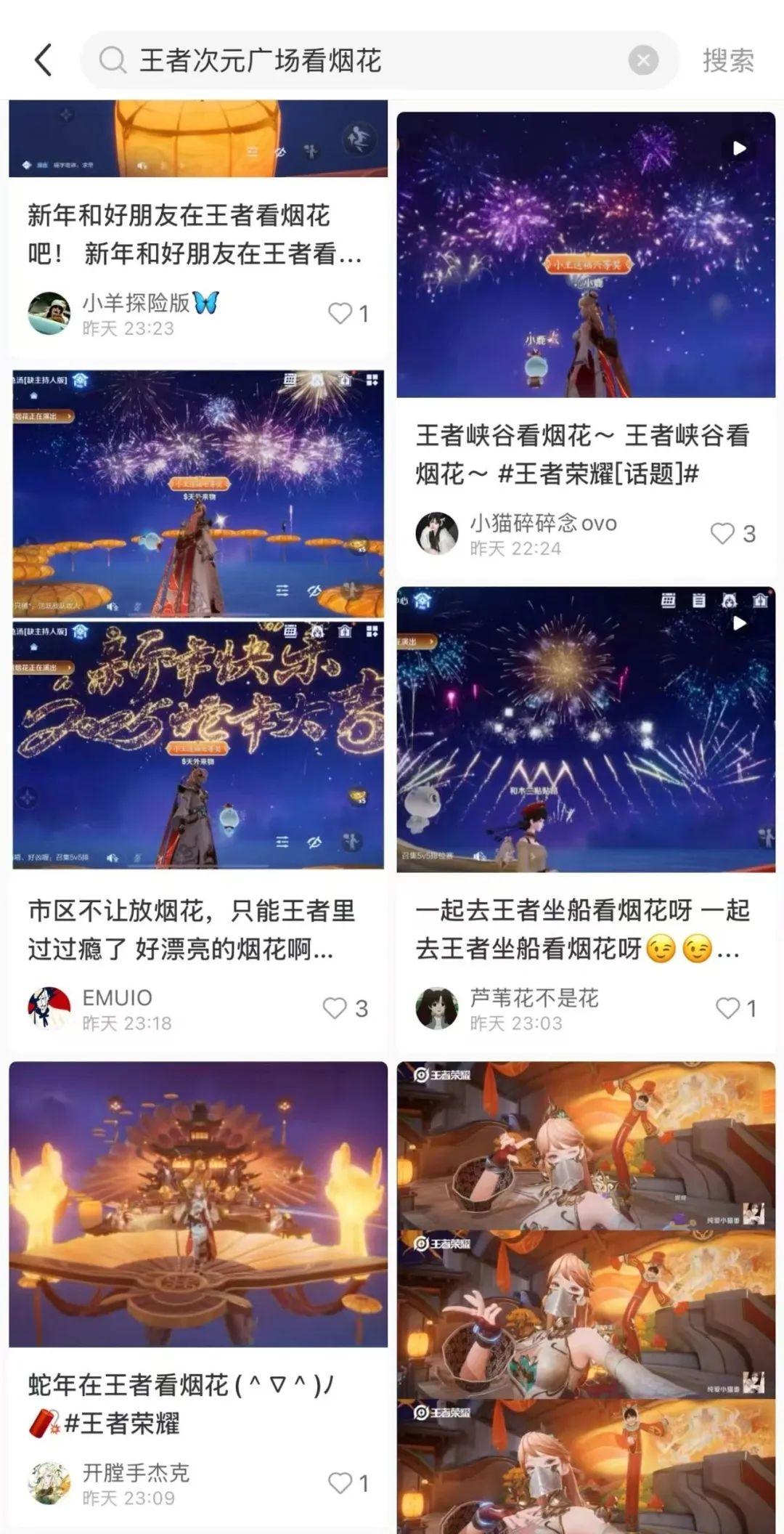 爲了增加年味氛圍,小王還在遊戲內了定時的煙花秀表演。大夥怎麼會放過這般視覺盛宴,有CP、親友立馬拉進遊戲一起看,不少網友感嘆“讓我深刻感受到春節氛圍的居然是王者榮耀”,現實裏沒放成煙花,結果在王者裏看爽了。